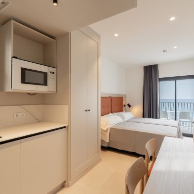 Vivir unas vacaciones con total independencia, pero con las ventajas que ofrece un hotel: así son nuestros estudios frente al Mediterráneo. Desde cada uno de nuestros apartamentos - Estudios RH Sol Benidorm podréis disfrutar de unas fantásticas vistas al mar, ya que estamos a tan sólo 25 metros de la playa de Levante. La cercanía a nuestro Hotel RH Sol Benidorm, a unos metros de los apartamentos, os permitirá poder contar con los servicios de recepción y restauración que tenemos. Además, no tendréis que preocuparos de la limpieza, ya que este servicio también está incluido porque queremos que lo único que hagáis sea, ¡disfrutar de Benidorm!