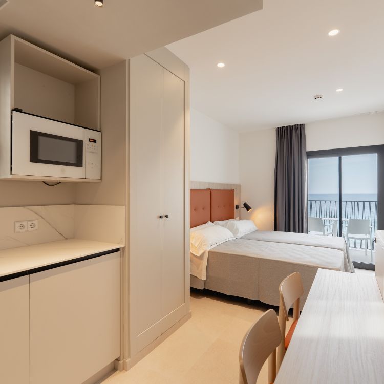 Vivir unas vacaciones con total independencia, pero con las ventajas que ofrece un hotel: así son nuestros estudios frente al Mediterráneo. Desde cada uno de nuestros apartamentos - Estudios RH Sol Benidorm podréis disfrutar de unas fantásticas vistas al mar, ya que estamos a tan sólo 25 metros de la playa de Levante. La cercanía a nuestro Hotel RH Sol Benidorm, a unos metros de los apartamentos, os permitirá poder contar con los servicios de recepción y restauración que tenemos. Además, no tendréis que preocuparos de la limpieza, ya que este servicio también está incluido porque queremos que lo único que hagáis sea, ¡disfrutar de Benidorm!